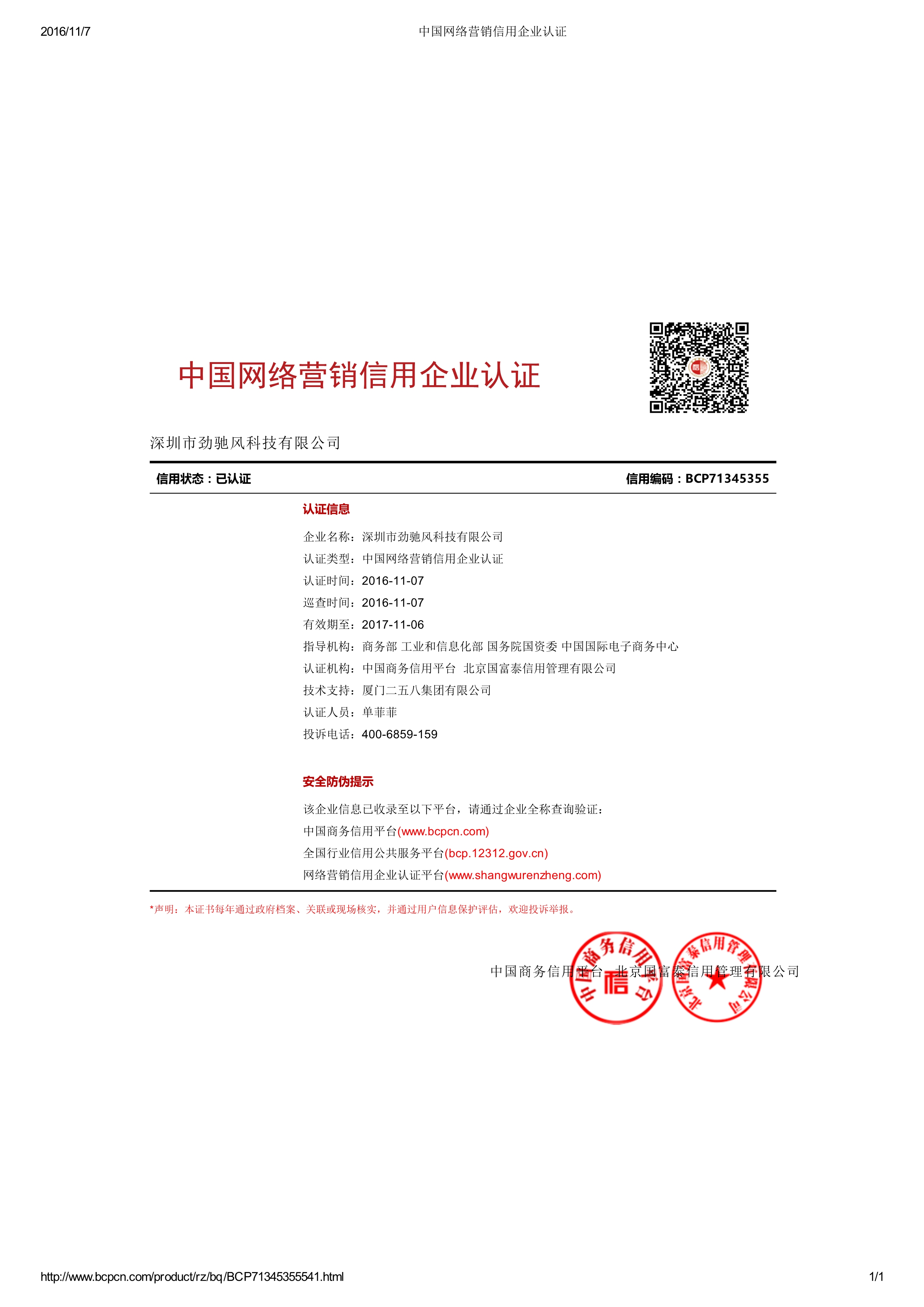 热烈祝贺本公司顺利通过中国商务信用平台“中国网络营销信用企业”认证(指导机构:商务部、工业和信息化部、国务院国资委、中国国际电子商务中心),也是本行业内首家获得此荣誉的企业。