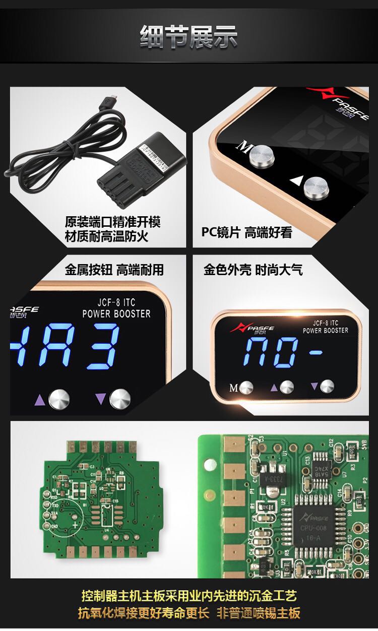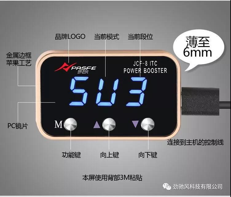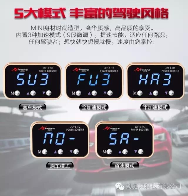 劲驰风科技是国内第一家汽车动力改装行业CCTV优选品牌,第八代节气门控制器首创的"智能防盗"、"智能学习"功能,更有五大驾驶模式:赛车模式、全加速模式、半加速模式、原车模式、省油模式,五大模式随你切换,完全颠覆您对传统节气门控制器(又名:电子油门加速器)的看法,这已经不是一个传统简单提升动力的加速器,而是一个更加智能的控制器了;在加上原有独创的"一键超车"、"一键原车"功能,第八代产品的性价比已经是业内最好。