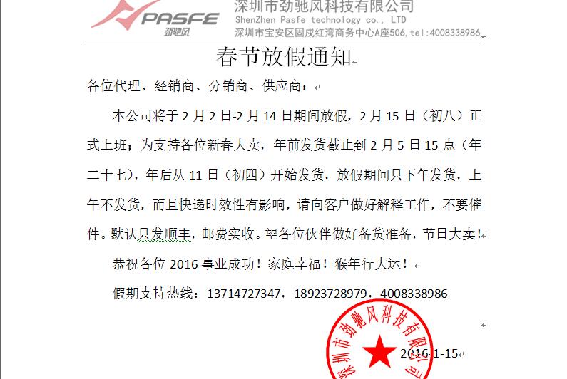 劲驰风科技2016年春节放假通知